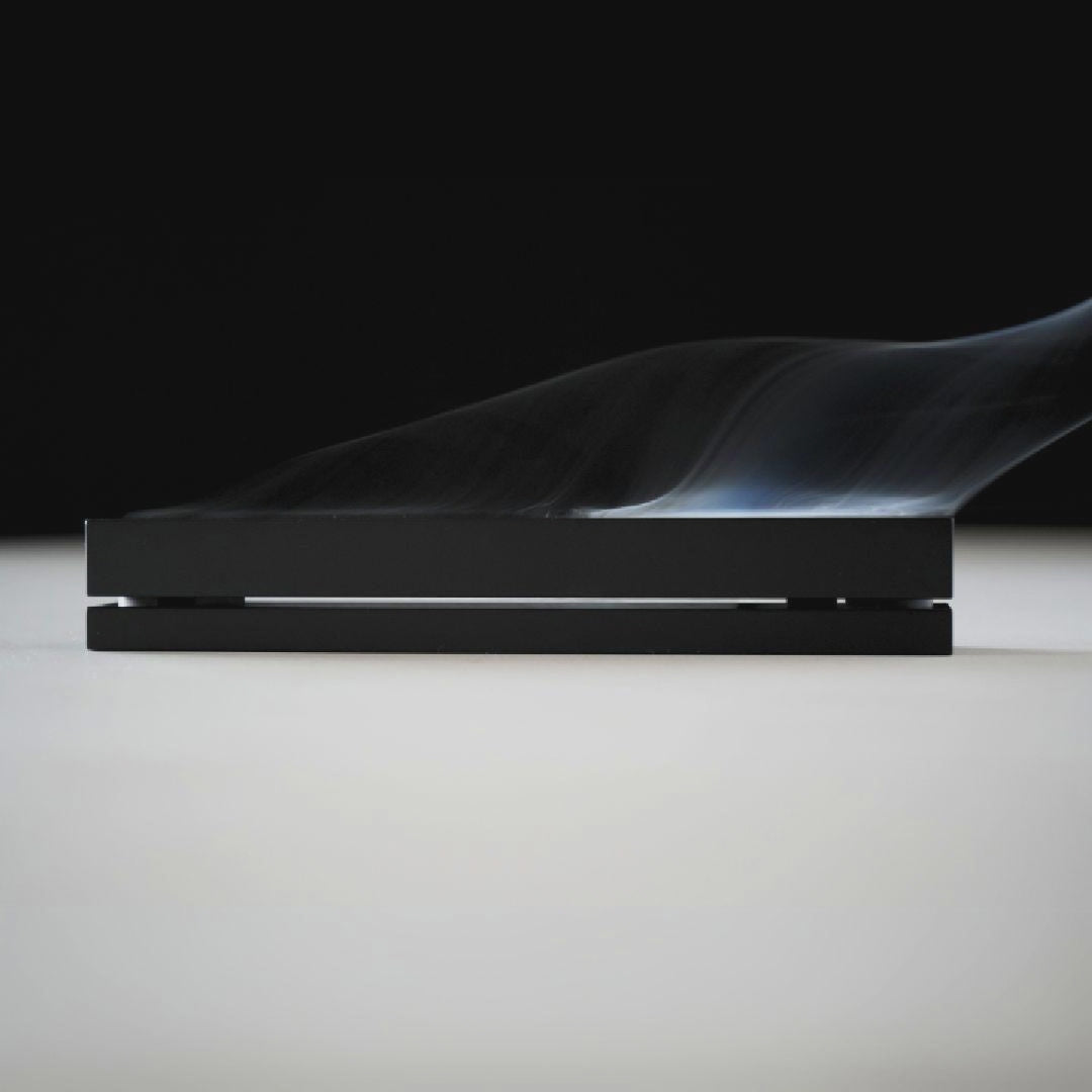 The incense lays on its side inside the burner, and the smoke gracefully drifts out the slits in the side, dancing along the top of the burner before drifting away.