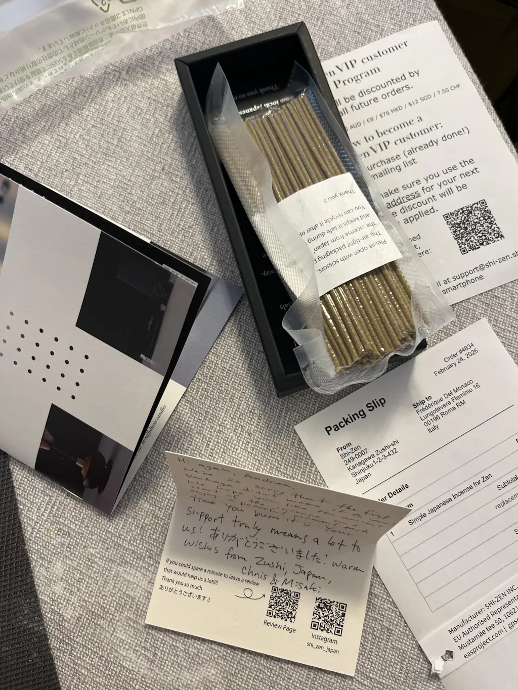 An extraordinary experience with Chris&Misaky, they truly surprise me with their kindness sending two times my shipment (the first was sent back to Japan due to a postal mistake in Italy) with no charges. I suggest of course the product, certainly the best scent I’ve ever tried.